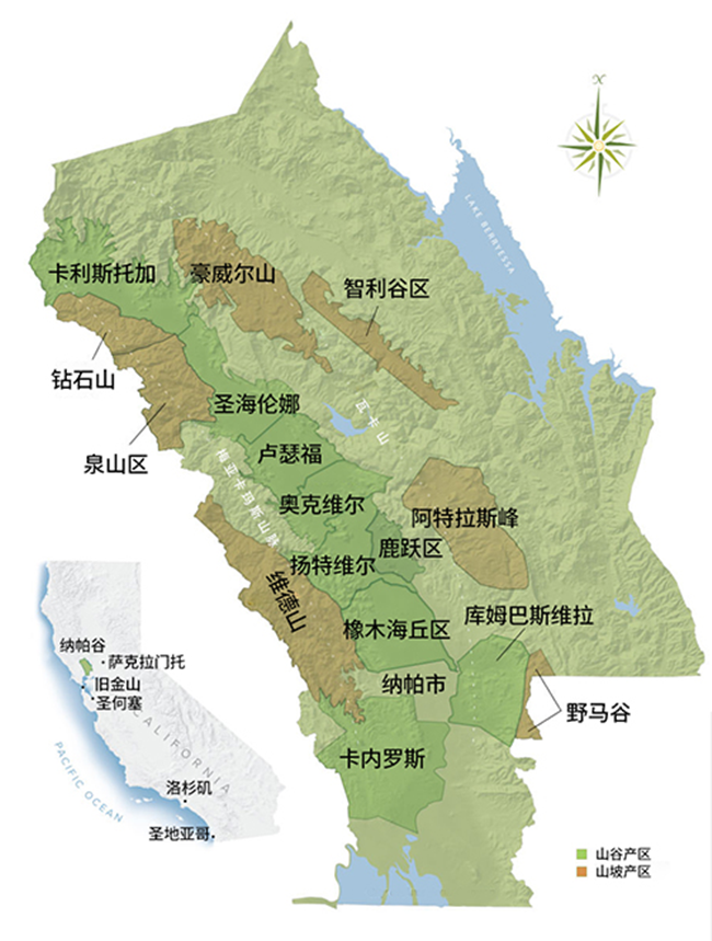 納帕谷坐落在圣帕布魯灣的北側以及舊金山灣(San Francisco Bay)地區的東北角,其東側是瓦卡山(Vaca),跨過這座山便可到達中央山谷(Central Valley)的北部,西側是梅亞卡瑪斯山(Mayacamas),也是納帕谷與索諾瑪縣(Sonoma County)的分界線。納帕谷南北長約50公里,東西跨度僅有幾公里,雖然面積不大,但這里是美國第一個農業保護區(Agricultural Preserve),也是加利福尼亞州的第一個法定種植區(American Viticultural Area,簡稱AVA)。根據不同的土壤、氣候和地形,產區內又細分為十六個法定種植區。