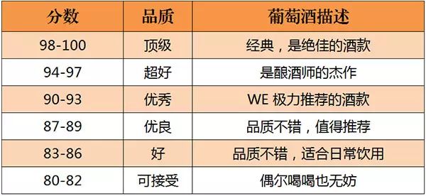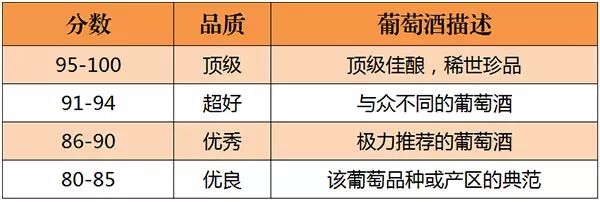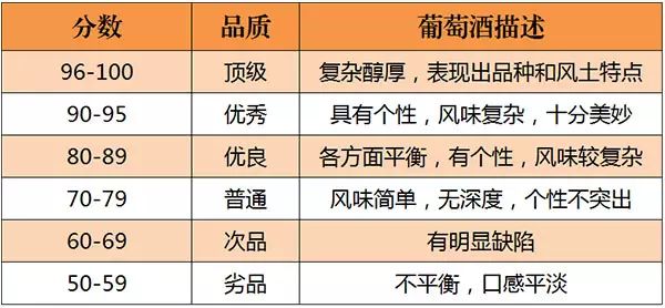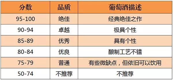 美國的《葡萄酒與烈酒》(Wine & Spirits)雜志是世界上最權(quán)威的葡萄酒雜志之一。自 1994年起,《葡萄酒與烈酒》也開始采取百分制對(duì)葡萄酒進(jìn)行評(píng)分,葡萄酒首先會(huì)經(jīng)過一些葡萄酒專業(yè)人士進(jìn)行初次品嘗篩選,之后才會(huì)送到專業(yè)“評(píng)酒團(tuán)”品評(píng),所以該雜志評(píng)分的葡萄酒品質(zhì)都不錯(cuò)。評(píng)分標(biāo)準(zhǔn)如下所示: