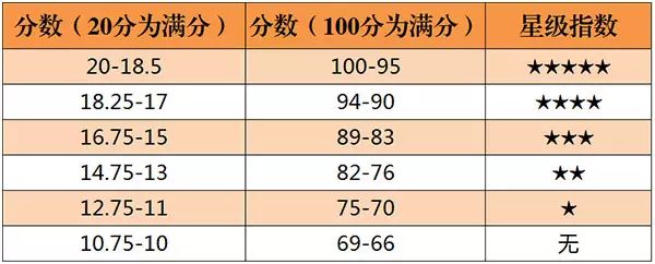英國的《醇鑒》(Decanter,簡稱 DE)雜志始創(chuàng)于 1975 年,是一本專門介紹世界葡萄酒及烈酒的專業(yè)雜志。由于英國幾乎不生產(chǎn)葡萄酒,加上其王室在歐洲的崇高地位,大眾普遍認(rèn)為英國對(duì)葡萄酒的評(píng)分會(huì)更客觀公正,因此《醇鑒》雜志在英語國家有著很大的影響力。該雜志評(píng)分采用 20 分制,0.25 分為最小單位,提供百分制換算,同時(shí)有從 0 星級(jí)到 5 星級(jí)的推薦規(guī)范: