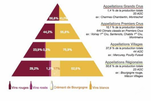 與波爾多完全不同的是,勃艮第并不是以酒莊為分級(jí)方法,而是以土地的位置為來進(jìn)行,表現(xiàn)如金字塔般垂直走向的方式,以原產(chǎn)地為命名系統(tǒng)(AOC)建立形成,井然有序的分級(jí)制度一直保存至今。