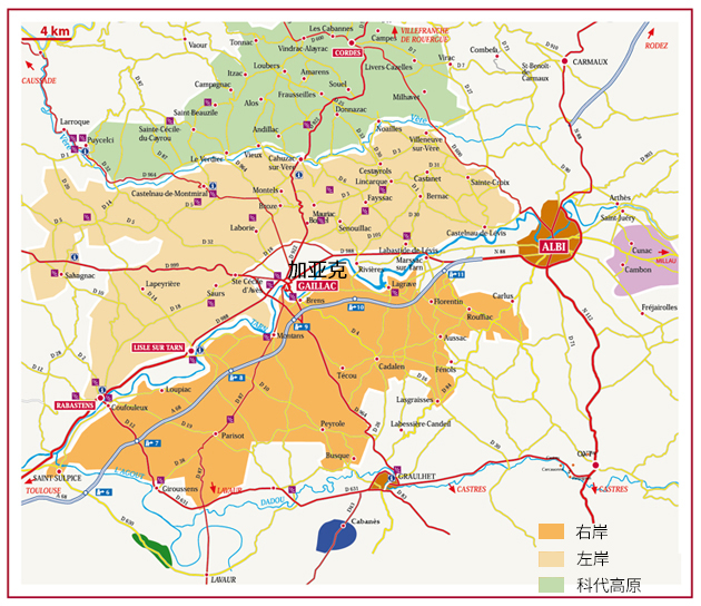 加亞克的3大主要子產(chǎn)區(qū)分別為右岸(Rive Droite)、左岸(Rive Gauche)和科代高原(Plateau Cordais)。其中位于塔恩河(Tarn River)以南的右岸產(chǎn)區(qū)地勢(shì)高,可俯瞰整個(gè)塔恩河。該產(chǎn)區(qū)的葡萄園以黏土和石灰?guī)r土壤為主,出產(chǎn)著優(yōu)質(zhì)的莫札克和布洛可。其中由莫札克釀成的酒既有優(yōu)雅柔順且回味悠長(zhǎng)的干型白葡萄酒,又有芳香馥郁的甜酒,而布洛可紅葡萄酒則充滿水果和香料風(fēng)味。塔恩河以北的左岸產(chǎn)區(qū)地勢(shì)較低,以鵝卵石、砂土和礫石為主,有著孕育優(yōu)質(zhì)紅葡萄酒的杰出風(fēng)土。這里出產(chǎn)的杜拉斯紅葡萄酒風(fēng)格強(qiáng)勁有力、單寧圓潤(rùn),而白葡萄酒雖不比右岸的脆爽,但采用蘭德樂(lè)釀成的白葡萄酒卻有著出色的復(fù)雜度。此外,該產(chǎn)區(qū)還出產(chǎn)著品質(zhì)優(yōu)異的遲摘(Late Harvest)葡萄酒。位于加亞克北部的科代高原以石灰?guī)r為主,其出產(chǎn)的白葡萄酒擁有清新的花香和果香,紅葡萄酒口感平衡、適宜陳年,桃紅葡萄酒果味芳香、酒體輕盈。
