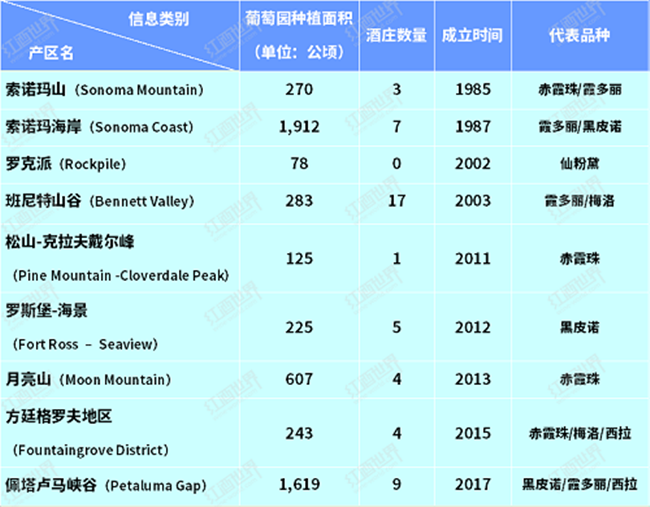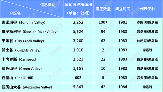 索諾瑪縣擁有多達17個AVA子產(chǎn)區(qū),每個產(chǎn)區(qū)都擁有自己獨特的歷史、地理條件和代表品種,以下兩個表格是索諾瑪縣子產(chǎn)區(qū)的基本信息概況。