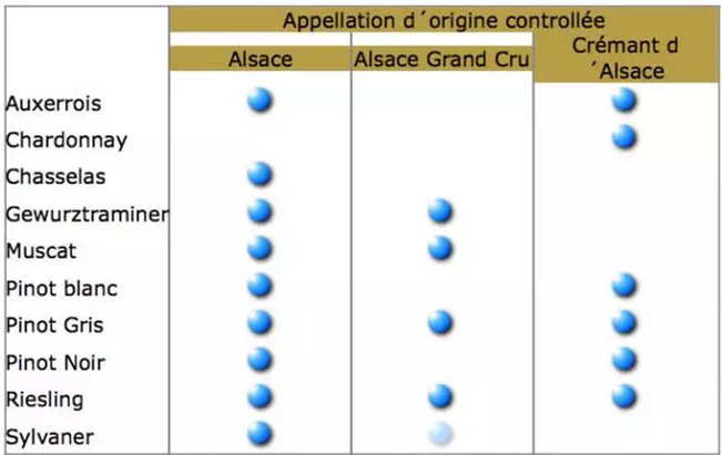 阿爾薩斯三種原產(chǎn)地命名制度和葡萄品種對應圖