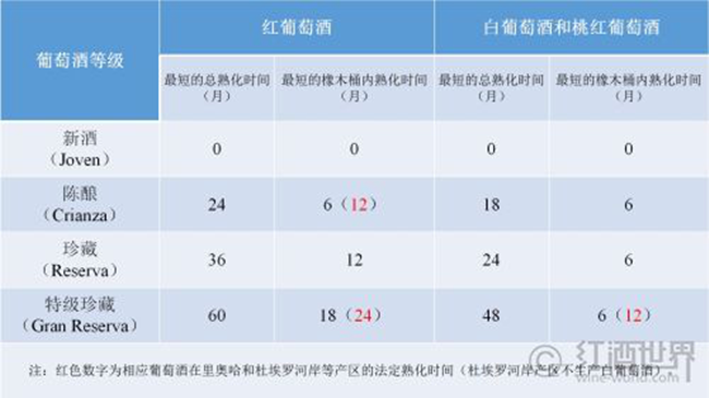 除了跟隨法國和歐盟的腳步之外,西班牙葡萄酒的分級也有著自己的特色,那就是對于DO及以上級別葡萄酒最短的總熟化時間和在橡木桶內熟化時間的要求。西班牙根據熟化時間將葡萄酒分為4個等級:新酒(Joven)、陳釀(Crianza)、珍藏(Reserva)和特級珍藏(Gran Reserva),這幾個術語也是我們常在西班牙紅酒的酒標上見到的。各級別對于熟化時間的要求見下表: