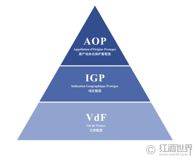 后來為了響應歐盟的改革并配合歐洲農(nóng)產(chǎn)品級別標注形式,法國于2012年推出新的分級體系——原產(chǎn)地命名保護制度(Appellation d'Origine Protegee,簡稱AOP)。這個體系從高至低包含原產(chǎn)地命名保護葡萄酒(AOP)、地區(qū)餐酒(Indication Geographique Protegee/IGP)與日常餐酒(Vin de France/VdF)三個級別,分別取代原來的AOC、VdP和VdT,并撤銷了VDQS 這一等級,原有的 VDQS 葡萄酒或升級為AOP,或降級為VdF。