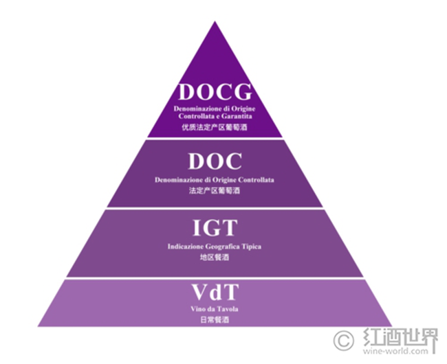 上世紀60年代之前,意大利尚沒有確立行之有效的葡萄酒分級制度,消費者難以在種類繁多的意大利葡萄酒中甄別出優(yōu)質(zhì)佳釀,這很大程度上阻礙了意大利葡萄酒在國際市場上的發(fā)展。于是從1963年開始,意大利便逐步建立并完善其葡萄酒分級體系,把葡萄酒劃分為4個品質(zhì)級別。