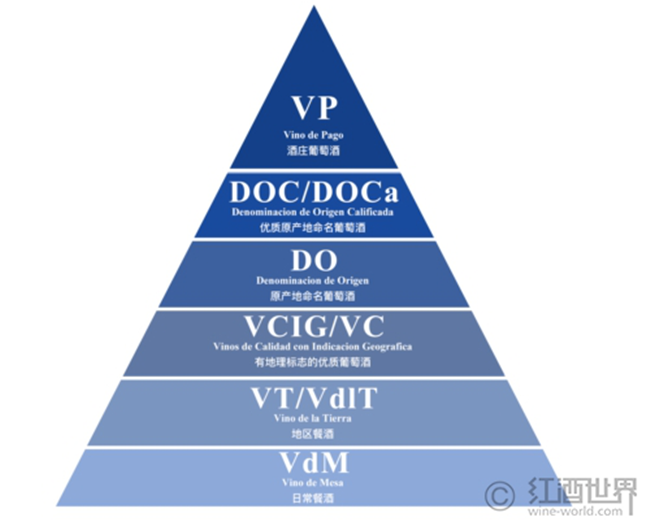 西班牙在20世紀30年代初期就擬定了原產(chǎn)地命名制度(Denominacion de Origen,簡稱DO),但直到70年代才正式頒布實施。傳統(tǒng)的西班牙葡萄酒分級體系和法國的等級劃分大有不同,不過自2003年改革后,其框架已越來越接近于法國的分級體系。西班牙的葡萄酒分級包含以下6個級別: