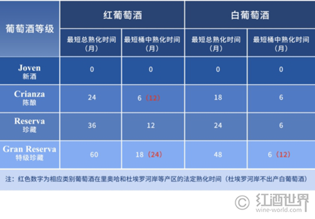 另外,西班牙葡萄酒的分級也有著自己的特色——規(guī)定了DO及以上級別葡萄酒的最短總熟化時間以及桶中熟化時間。根據(jù)熟化時長,西班牙葡萄酒分為新酒(Joven)、陳釀(Crianza)、珍藏(Reserva)和特級珍藏(Gran Reserva)這4個等級。