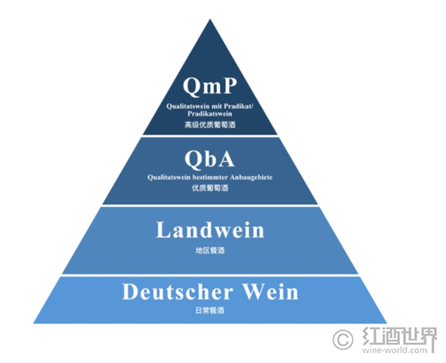 簡單來說,德國葡萄酒分為日常餐酒(Deutscher Wein)、地區(qū)餐酒(Landwein)、優(yōu)質(zhì)葡萄酒(Qualitatswein bestimmter Anbaugebiete/QbA)和高級優(yōu)質(zhì)葡萄酒(Pradikatswein)4個等級。