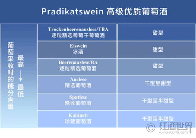 值得一提的是,由于德國所處緯度較高,氣候較為寒冷,葡萄成熟度對葡萄酒的品質(zhì)影響重大,所以相關(guān)機構(gòu)又根據(jù)葡萄采收時的成熟度,將高級優(yōu)質(zhì)葡萄酒細分為以下6個等級: