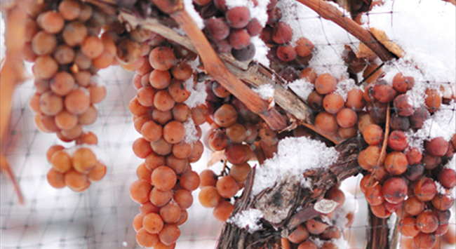 釀制冰酒的葡萄成熟度應至少達到BA的水平,且需在果實中的水分已結(jié)冰的狀態(tài)下人工采摘和壓榨,以獲得糖分、酸度和風味物質(zhì)高度濃縮的葡萄汁。這種情況下壓制出來的果汁非常少,因此冰酒產(chǎn)量極低,平時釀造一瓶酒的等量葡萄或許僅能釀制一杯冰酒。因?qū)μ鞖鈼l件要求高,冰酒同樣不是每一年都能釀造的。