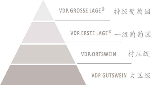 除此之外,由德國頂尖酒莊組成的德國名莊聯(lián)盟(Verband Deutscher Pradikatsweinguter,簡稱VDP)也推出了適用于成員酒莊的分級體系。與官方的分級制度不同,該體系依據(jù)葡萄園的質(zhì)量和風土特點、葡萄種植技術(shù)及年份品質(zhì),將葡萄園分為4個等級。