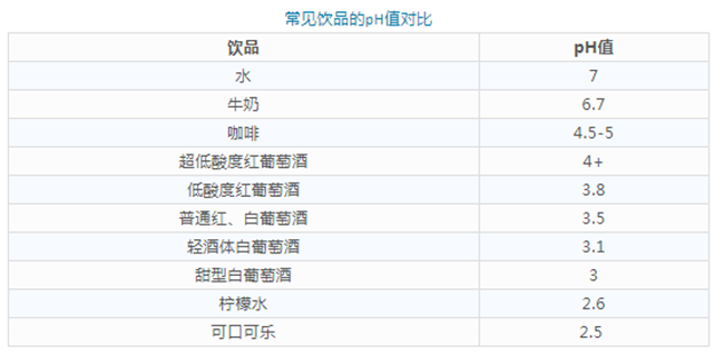 首先,所有類型的葡萄酒無一例外都是“酸性”的,絕大多數(shù)葡萄酒的pH值都介于3~4之間(理想情況下,白葡萄酒的pH值在3.0~3.4之間,而紅葡萄酒在3.3~3.6之間),低于咖啡,但比檸檬水稍高。