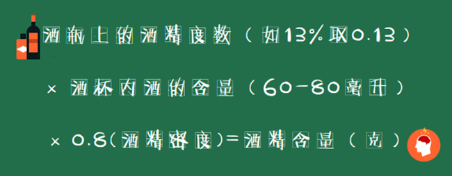 大家常飲用的葡萄酒度數(shù)一般為11 - 13%,按照不超過酒杯1/3的倒酒標(biāo)準(zhǔn),一杯葡萄酒通常有60 - 80毫升。按下圖計(jì)算公式,喝一杯葡萄酒,你將攝入5 - 8克酒精。