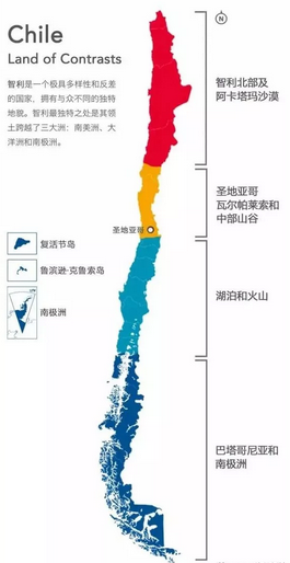 智利是世界上地形最狹長的國家,由于從北到南,跨度較大,從而形成了 4 個大產區!
