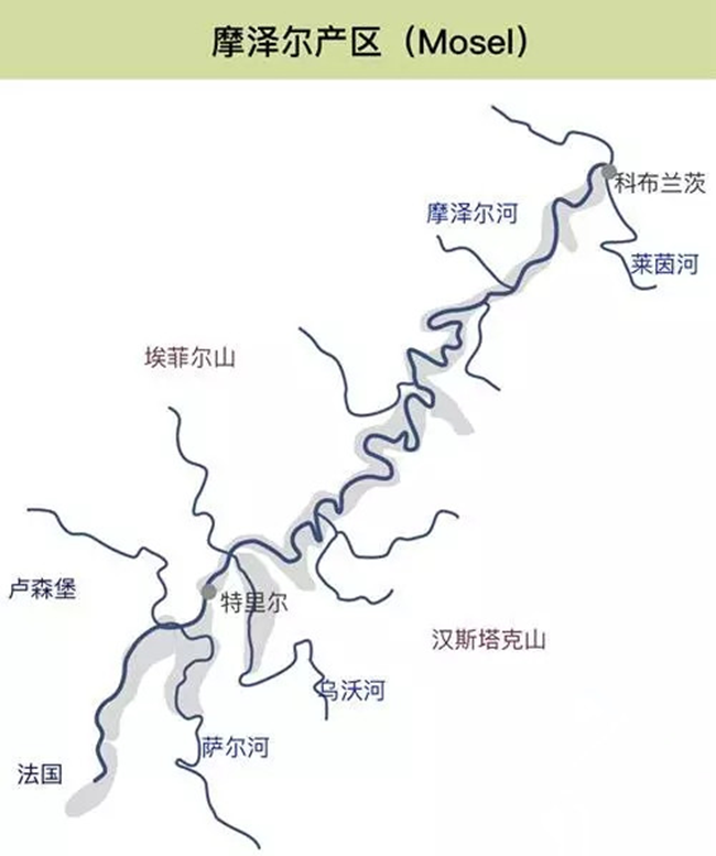 摩澤爾產區的名字以前是摩澤爾-薩爾-烏沃(Mosel-Saar-Ruwer),但為方便消費者記憶,后改稱為摩澤爾。摩澤爾氣候涼爽,葡萄品種以雷司令為主,出產全世界最精美也是最為昂貴雷司令葡萄酒的伊貢米勒酒莊就坐落著這里。此外,露森酒莊(Dr. Loosen)、普朗酒莊(Weingut Joh.Jos.Prum)和瑪斯莫麗酒莊(Markus Molitor)也是摩澤爾地區的優秀名莊。