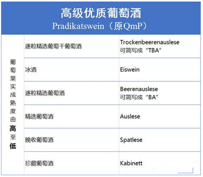 德國與歐洲其他國家最明顯的不同是對最高級別的葡萄酒又根據葡萄果實的成熟度進行了細分