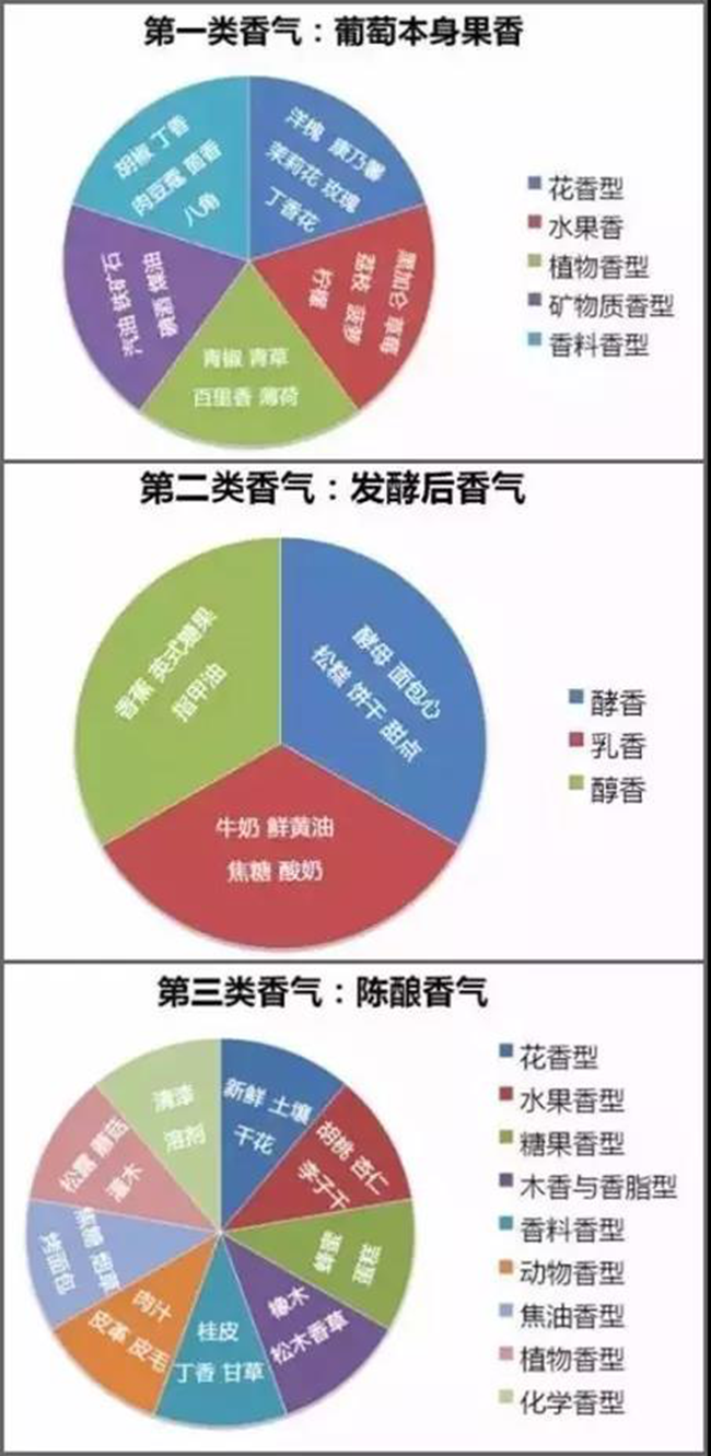 葡萄酒一共有三大類香氣,分別是葡萄本身香氣、發酵產生香氣、陳釀產生香氣,下面的三張圖就具體描述了這三類香氣。