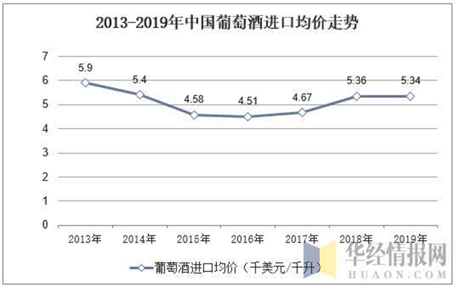 從進(jìn)口均價(jià)來(lái)看,近年來(lái)我國(guó)葡萄酒進(jìn)口均價(jià)基本維持在5千美元/千升,2015年葡萄酒進(jìn)口均價(jià)下降至5千美元/千升以下,2016年以后葡萄酒進(jìn)口價(jià)格又逐漸開始回升,據(jù)海關(guān)統(tǒng)計(jì)數(shù)據(jù)顯示,2019年國(guó)內(nèi)葡萄酒進(jìn)口均價(jià)為5.34千美元/千升,與2018年基本持平。
