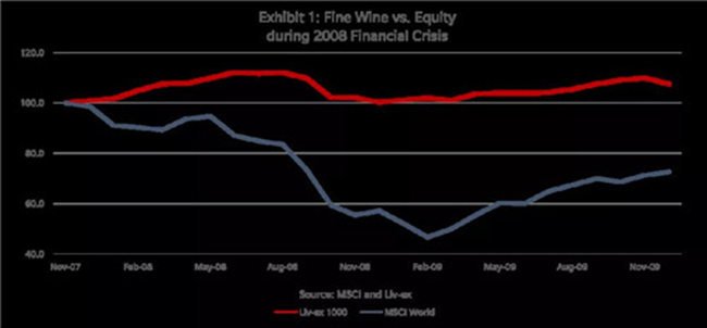 精品葡萄酒投資公司Cult Wines近日也發(fā)布了一份關(guān)于精品葡萄酒投資的統(tǒng)計分析報告,報告稱在2007年11月至2009年11月的整個金融危機(jī)期間,Liv-ex 1000指數(shù)的表現(xiàn)始終優(yōu)于摩根士丹利資本國際全球指數(shù)(Morgan Stanley Capital International Index,簡稱MSCI指數(shù),是一個市值加權(quán)股票市場指數(shù))。