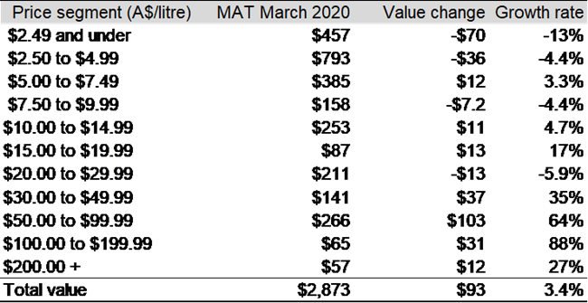 截至 2020 年 3 月底的 12 個月中,出口額最大的降幅主要出現在價格低于 5 澳元/升(離岸價)的澳大利亞葡萄酒。相反,價格高于 10 澳元/升(離岸價)的葡萄酒出口額則增長了 22%至 10.8 億澳元,特別是價格區間在 50 至 99.99 澳元之間的葡萄酒成為驅動澳大利亞葡萄酒出口額增長的主力軍。