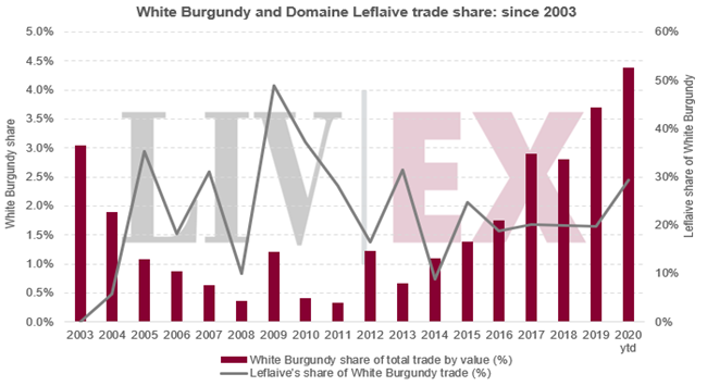 在二手市場上,勒弗萊Leflaive葡萄酒占了勃艮第白葡萄酒很大部分的交易。 2009年,雖然勃艮第白葡萄酒僅占總交易1.2%,但當中勒弗萊卻占了一半以上。 本年至今,勃艮第白葡萄酒占總交易已增至4.3%;當中勒弗萊也占近三分之一。