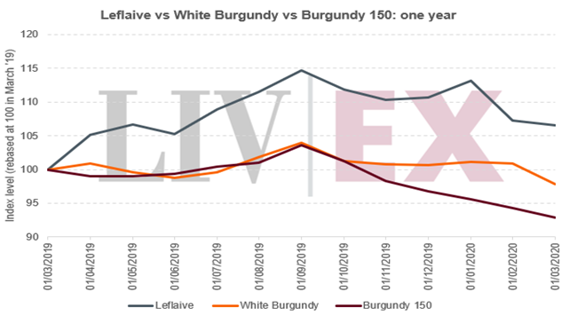 然而,在過去的一年,勒弗萊(6.5%)的表現也優于勃艮第150(-7.2%)。 事實上,勃艮第150指數是表現最差的Liv-ex 1000分項指數; 我們在最近的專題報告: 高峰后的勃艮第 中也探討了它的跌勢。