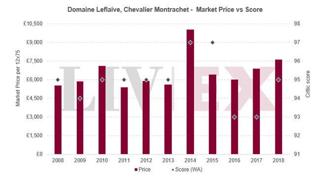 最后,下圖比較了勒弗萊的Chevalier Montrachet(該品牌交易最活躍的葡萄酒)最近十個年份的市場價格。 它最新的2018年份自去年12月在英國發布以來,市場價格已漲了19%。
