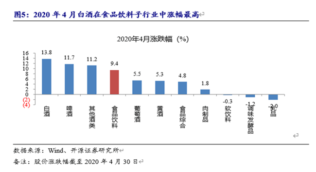 尤其是進(jìn)入2020年4月份以來(lái),食品飲料板塊上漲9.4%,其中重要原因是:國(guó)內(nèi)疫情控制得當(dāng),消費(fèi)回暖,以白酒為代表的可選消費(fèi)重新獲得市場(chǎng)青睞,漲幅領(lǐng)跑各大品類,為13.8%,而葡萄酒銷售亦有上漲趨勢(shì),為5.5%。