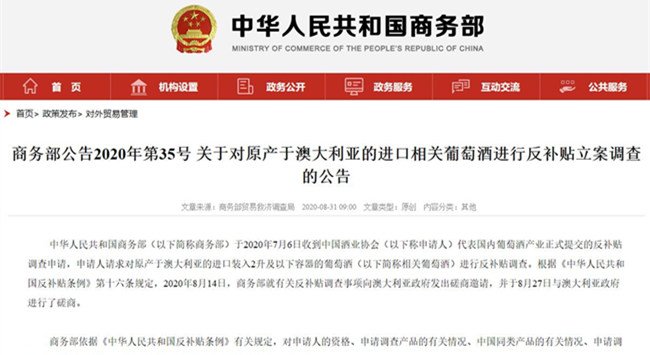 根據(jù)上述審查結(jié)果,依據(jù)《中華人民共和國反補(bǔ)貼條例》第十六條的規(guī)定,商務(wù)部決定自2020年8月31日起對(duì)原產(chǎn)于澳大利亞的進(jìn)口相關(guān)葡萄酒進(jìn)行反補(bǔ)貼立案調(diào)查。現(xiàn)將有關(guān)事項(xiàng)公告如下: