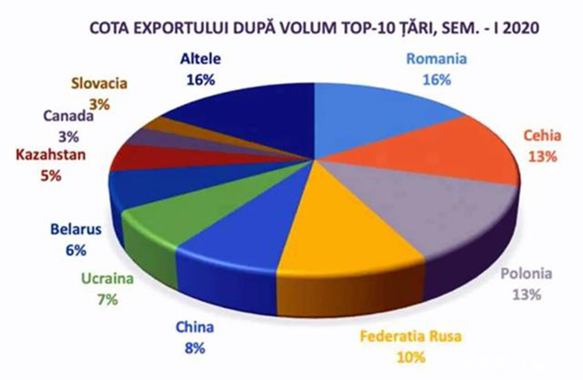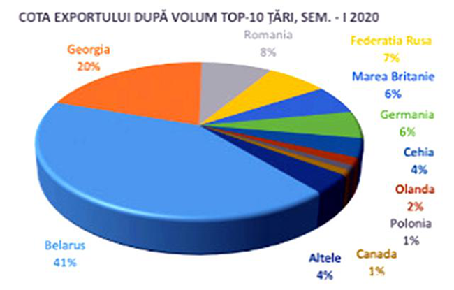 摩爾多瓦向56個(gè)國(guó)家和地區(qū)的出口總額為12.478億列伊, 比2019年前6個(gè)月下降了5.7%(即減少了7470萬(wàn)列伊)。