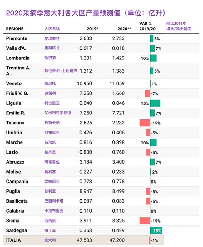 9月初,意大利釀酒師及釀酒技術(shù)協(xié)會 (Assoenologi)、意大利農(nóng)業(yè)及食品市場研究所(ISMEA)和意大利葡萄酒聯(lián)合會(UIV)共同發(fā)布了《2020年意大利葡萄年份預(yù)測報告》。報告顯示,2020年意大利葡萄酒產(chǎn)量約達47.2億升,同比2019年略微下降1%。今年意大利政府及各大葡萄酒產(chǎn)區(qū)協(xié)會為緩解新冠疫情對葡萄酒產(chǎn)業(yè)的沖擊,力推各項葡萄減產(chǎn)措施,這是今年意大利葡萄酒產(chǎn)量輕微下降的主要原因。