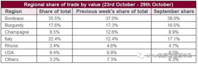 就Liv-ex上的交易總值份額而言,波爾多仍是最高(35.5%),但自年初以來(54.5%)已跌了很多。意大利保持在本年的平均水平(22.4%);美國創(chuàng)10月份新高(9.4%)。勃艮第也保持穩(wěn)定;而香檳(8.5%)、羅納(3.4%)和其它酒區(qū)(3.2%)則有回落。