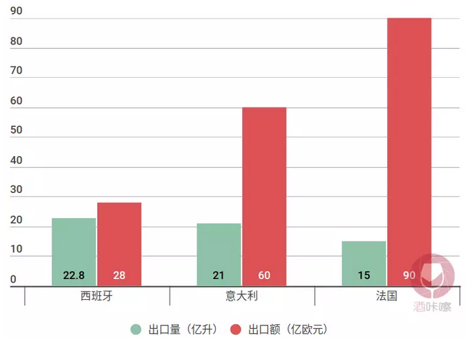 2017,西班牙葡萄酒的出口量超越法國和意大利,位居世界第一,不過盡管西班牙葡萄酒出口量如此龐大,它與意大利和法國葡萄酒所帶給人的印象完全不同,在人們的印象中,西班牙葡萄酒向來價格便宜,而這一點在其出口額上也能體現。