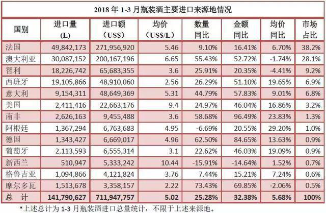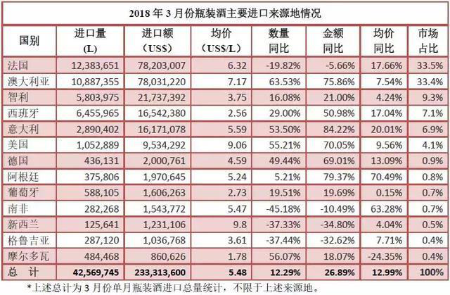 從3月份單月數(shù)據(jù)看,瓶裝酒進(jìn)口量4257萬升,同比增長(zhǎng)12.3%,進(jìn)口額2.3億美元,同比增長(zhǎng)26.7%。各主要進(jìn)口來源地整體呈上行態(tài)勢(shì),就前五大進(jìn)口來源地而言,僅法國(guó)量額雙雙下行,澳大利亞、意大利增速領(lǐng)跑,智利、西班牙亦有不小增幅。