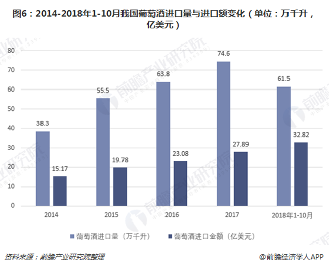 由下圖可見,隨著關稅降低,2014-2017年以來國內葡萄酒進口量和進口金額逐年穩步增長。2018年前10月,葡萄酒進口依舊活躍,進口量達61.5萬千升,進口額實現32.82億美元,與國內疲軟的產量數據形成對比,反映出我國對葡萄酒的需求仍然較強,且進口葡萄酒的市場占有力已經遠超國產酒。