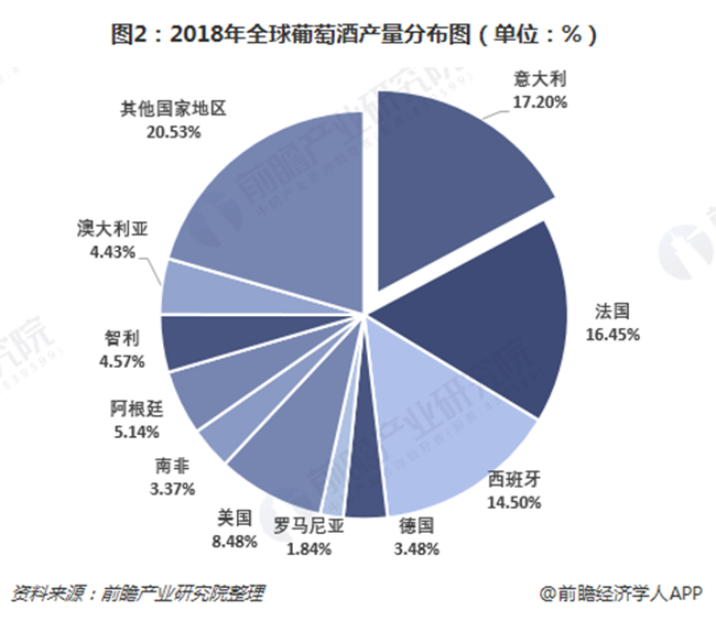 分區域看,2018年意大利以48.5億升的產量再次成為世界葡萄酒最大生產國,占據了全球17.2%的葡萄酒生產市場;法國以46.4億升緊隨其后,占全球比重16.45%;西班牙產量40.9億升,排名第三。另外,阿根廷經過兩年產量低谷后,在2018年表現亮眼,產量較上年增長23%,達到14.5億升,躋身全球第五。