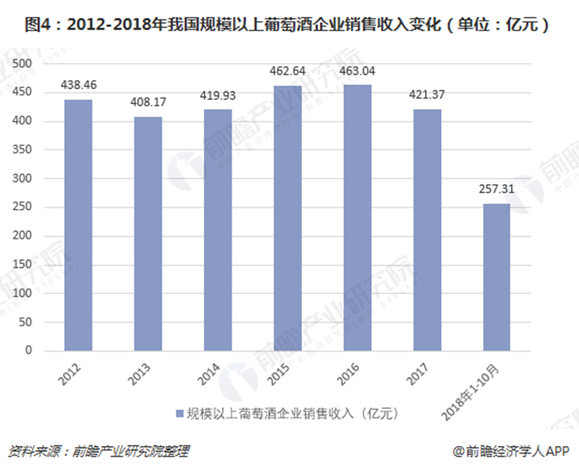 2018年前10月,我國規模以上葡萄酒企業銷售額為257.31億元,較上年同期下滑6.79%。進入2018年,進口葡萄酒大量涌入加上進口葡萄酒產品價格區間進一步下移,導致國內葡萄酒市場尤其是中低價位葡萄酒市場競爭十分激烈。