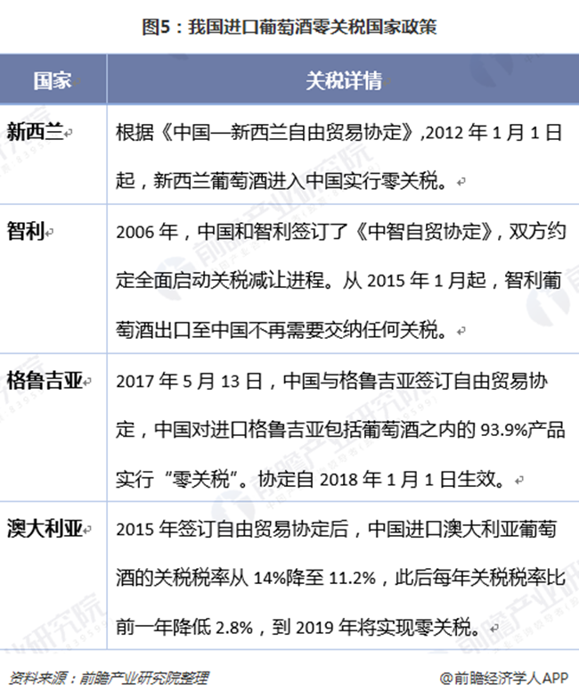 我國分別于2012年和2015年先后對新西蘭和智利進口葡萄酒實施零關稅,僅需繳納消費稅10%和增值稅16%。2018年起格魯吉亞進口葡萄酒也加入零關稅隊伍。根據中澳自貿協定,至2019年,我國進口澳大利亞葡萄酒的關稅將逐年降至零。關稅下行,不僅刺激著中國進口葡萄酒市場的發展,使進口葡萄酒的競爭進入白熱化階段,對中國國產葡萄酒市場份額的擠壓也是無可避免。