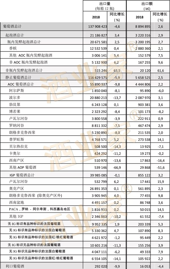 據FEV S(法國葡萄酒及烈酒出口商聯盟)發布的2018年法國葡萄酒與烈酒出口報告顯示,2018年法國 對外出口量下降2.7%,至1.93億箱; 出口額增長2.4%,超過132億歐元。