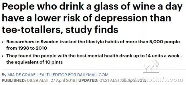Daily Mail日前報(bào)道過(guò)這樣一則新聞:每天喝一杯葡萄酒,可以降低抑郁癥發(fā)生的風(fēng)險(xiǎn)。
