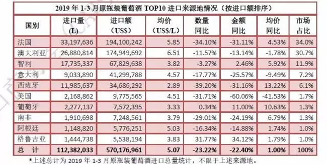 近日,中國食品土畜進出口商會酒類進出口商分會發布2019年一季度酒類進口統計報告。報告顯示,一季度,進口酒類市場整體呈下行態勢,且降幅仍在擴大。其中,葡萄酒進口延續跌勢,量額跌幅均逾兩成。進口量1.5億升,進口額6.2億美元,約占酒類進口總額的55.4%。