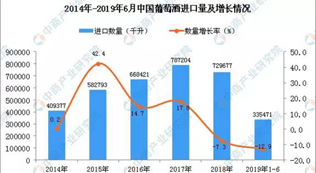 近日,中商產(chǎn)業(yè)研究院發(fā)布了一份2019年1-6月中國(guó)葡萄酒進(jìn)口數(shù)據(jù)。以下是今年上半年中國(guó)葡萄酒進(jìn)口數(shù)量及金額增長(zhǎng)率情況。