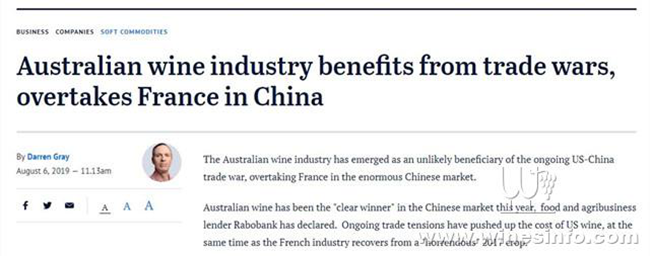 2018年澳洲對中國葡萄酒出口量上漲19.8%,且在2019年的前4個月中更是上漲了25.7%。(網頁截圖/《時代報》)