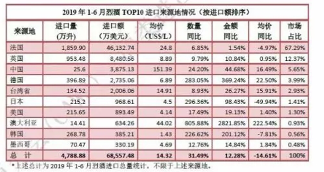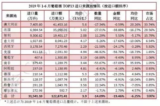 • 2019上半年進口烈酒增幅明顯 智利躍居葡萄酒進口量第一位