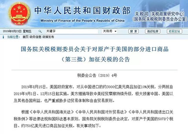 公告顯示:2019年8月15日,美國政府宣布,對從中國進口的約3000億美元商品加征10%關(guān)稅,分兩批自2019年9月1日、12月15日起實施。美方措施導(dǎo)致中美經(jīng)貿(mào)摩擦持續(xù)升級,極大損害中國、美國以及其他各國利益,也嚴重威脅多邊貿(mào)易體制和自由貿(mào)易原則。