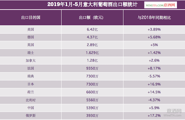 在今年前5個月意大利葡萄酒的各出口國中,表現(xiàn)最積極的海外市場仍然是美國,其次是德國和英國。在2019年前五個月,意大利對美國的葡萄酒出口額達到了6.42億歐元,較2018年同期增加了3.89%。