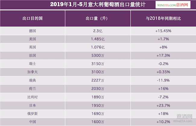 從出口量來看,2019年前5個月,意大利葡萄酒對德國的出口量最大,達到2.3億升,較2018年同期增加了15.45%。對美國的出口量為1.485億升,較上一年同期增加了1.7%;對英國的出口量為1.076億升,較上一年同期增加了8%。