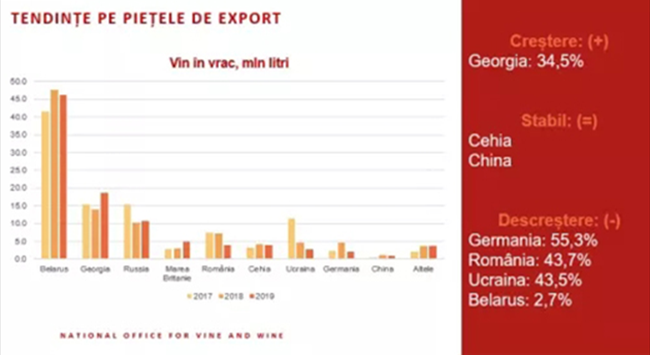 在2018-2019葡萄酒年度,摩爾多瓦共和國葡萄酒出口總量為14.1萬千升(-1.8%),其中包含4.24萬千升(56716.904瓶)瓶裝葡萄酒(-1.5%)以及9.82萬千升(-1.8%)散裝葡萄酒。