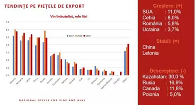 波蘭、羅馬尼亞、捷克、中國和俄羅斯仍然是摩爾多瓦瓶裝葡萄酒的主要市場。出口到美國(+11%)、捷克共和國(+8%)、羅馬尼亞(+5.8%)、烏克蘭(+3.7%) 的瓶裝葡萄酒數(shù)量有所增加,出口到中國和拉脫維亞的數(shù)量保持穩(wěn)定,但是出口至哈薩克斯坦(-30%)、俄羅斯(-16.9%)、加拿大(-11.8%)、波蘭(-5%)的瓶裝葡萄酒數(shù)量有所下降。